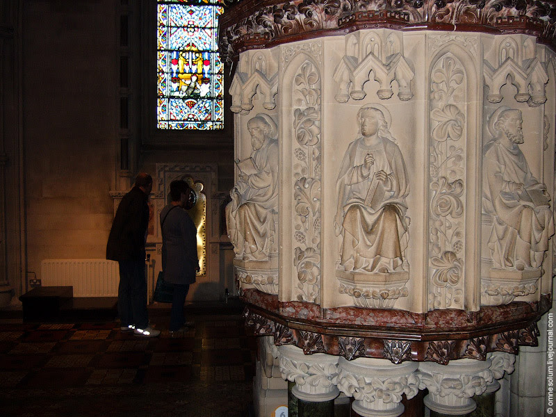Войдём внутрь собора. Колонны нефа относятся к началу 13-ого века. Каждая колонна облицована дандрийским камнем, привезённым из Бристоля.